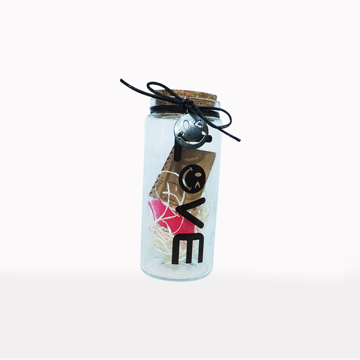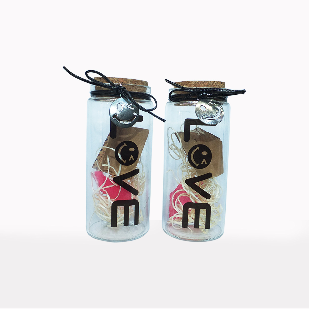 Üzerinde gülücük ifadesi bulunmaktadır. Şişenin üzerinde “Love” yazmaktadır. İçerisinde ikişer tane olmak üzere dört tane küçük mektup deseninde not kağıdı bulunmaktadır.