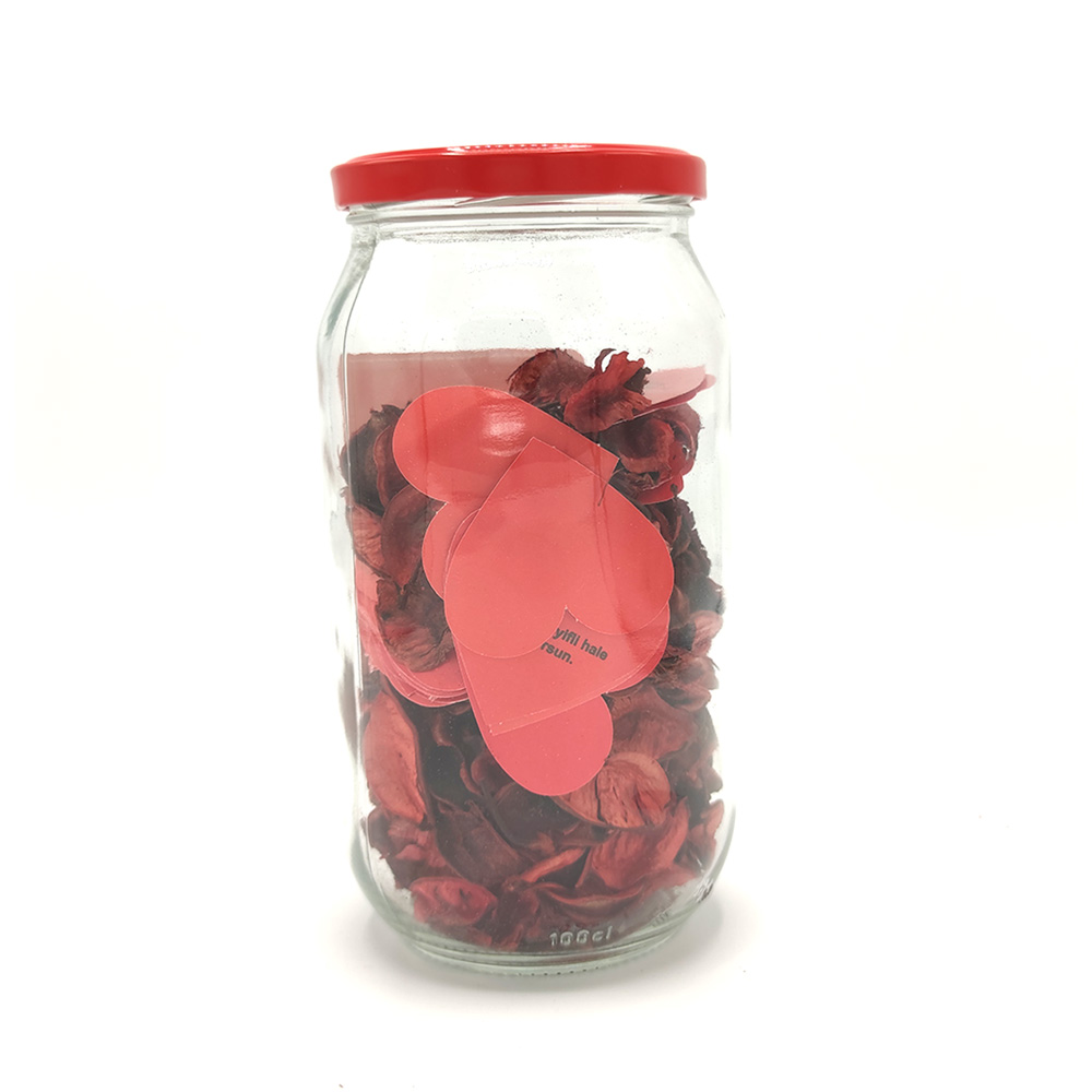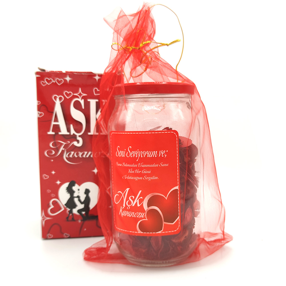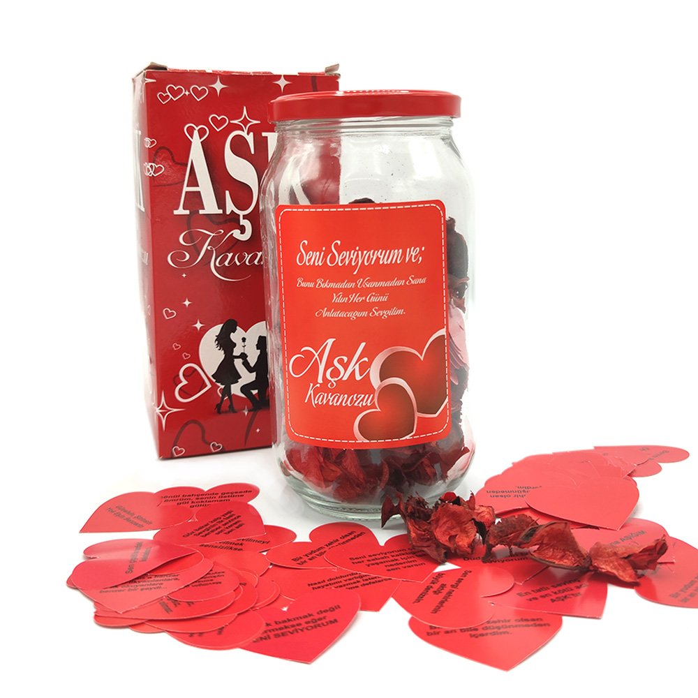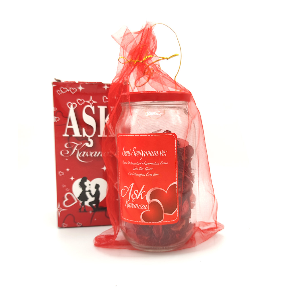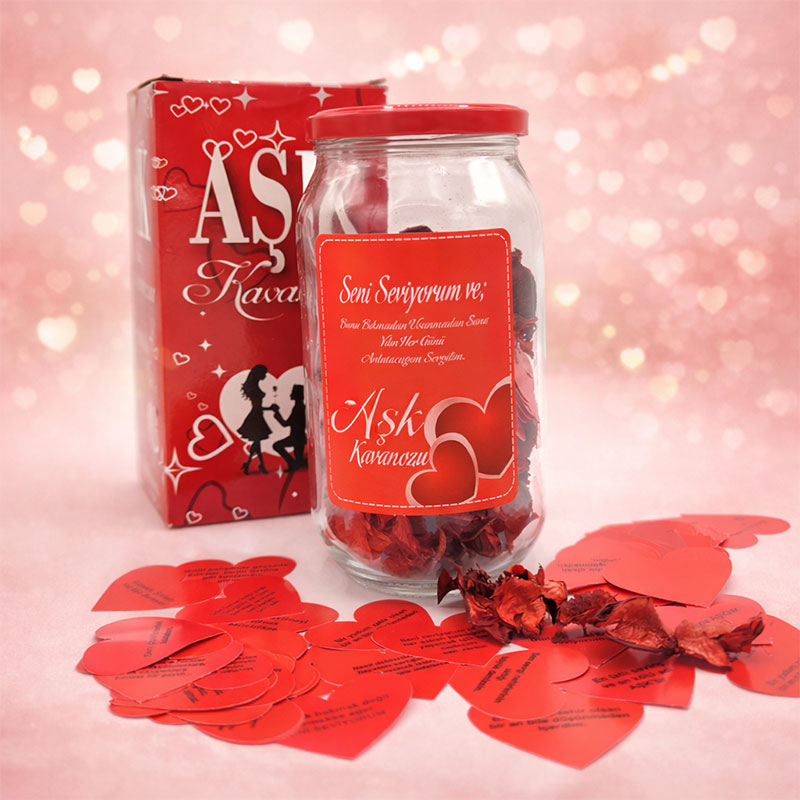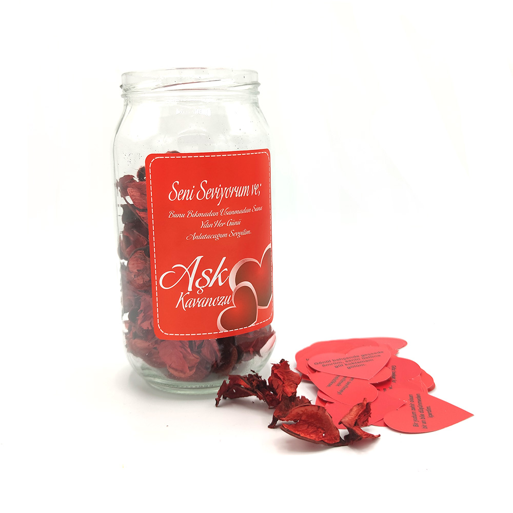 Aşk Kavanozu içinde kurutulmuş gül yaprakları ve her güne özel 365 adet aşk sözleri ve gül kuruları bulunmaktadır. 1 yıl boyunca her gün için ayrı bir aşk mesajı. 365 adet sevgi mesajı dolu bir kavanoz! Aşk dolu kavanoz ile güne aşk mesajınızla başlayın. Yüksek dozda sevgi içerdiği için günde 1 kez kullanılmalı. Romantik olduğu kadar özel bir ürün.