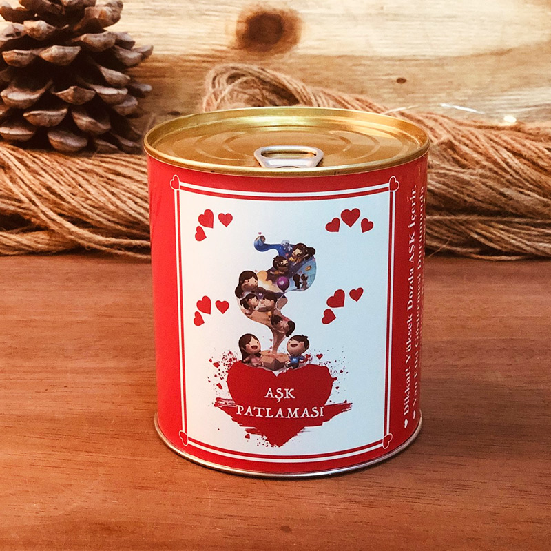 Konserve tamamı metal malzemeden imal edilmiş. 1 Kilogramlık konserve ile bire bire ebatlara sahiptir. Ürün içerisinde sevgiliye özel olarak tasarlanmış ürünler bulunmaktadır. Aşk sözleri yılın her gününe özel 365 adettir. Sözler kalp şeklindeki kırmızı özel kağıtlara basılmıştır. Aşk meleği kaliteli polyester malzemeden imal edilmiştir. Aşk meleği 9cm x ebatlarındadır. Dilek şişesi cam malzemeden imal edilmiştir. Şişe içerisinde dileğinizi yazabileceğiniz özel dilek kağıdı bulunmaktadır. Tarafınıza ağızı kapalı biçimde gönderilmektedir.