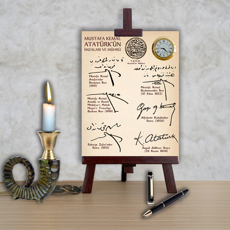 Atatürk İmzaları Afiş Saat .Ulu Önder Mustafa Kemal Atatürk’ün çeşitli zamanlarda kullandığı imzaları ve mührü kronolojik olarak sıralanmış ve tasarımı yapılmıştır.