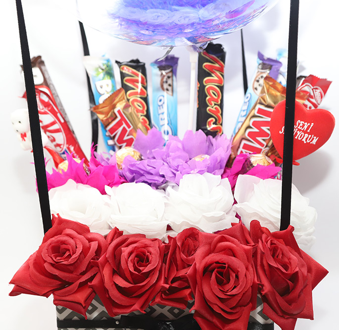 Şık ve özel tasarlanmış bir kutuda. Birbirinden kaliteli ve lezzetli çikolataların size sunulduğunu hayal edin. Hem de üstünde size özel tasarlanmış bir balon. İstediğiniz sevgi sözcüklerine siz karar verin , biz tasarlayıp size sunalım.