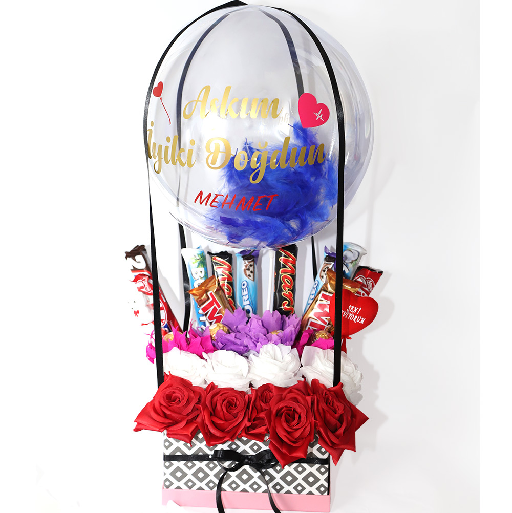 Balonun için dekoratif tüyler, üstünde ise istediğiniz yazı ve isim yer almaktadır. Kutunun içindeki gerçek görünümlü yapay güller , çikolata çiçekler ile harika bir sunum.