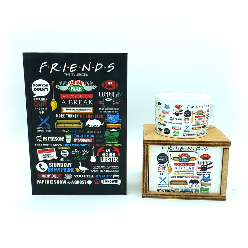 Friends Defter Ve Kupa, friends dizisinde ki figürlerin baskısından oluşan defter ve kupa settir. Dizi hayranlarının severek kullanacağı bir settir. Sevdiklerinize de alabileceğiniz güzel bir hediye alternatifidir. İki farklı defter seçeneğinden istediğinizi seçebilirsiniz.