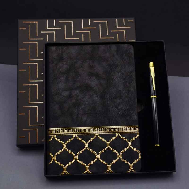 Gold Desenli Siyah Deri Defter ve Kalem Seti, öğretmenler günü ve kurumsal hediyeler için şık, zarif ve özel tasarımlı bir hediyedir.