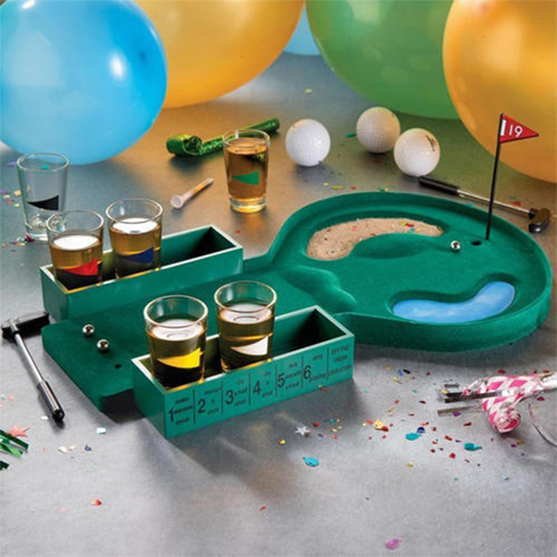 Golf Drinking Game kutusu içerisinden 6 adet shot bardak, 1 adet golf sahası, 2 adet golf sopası, 2 adet golf topu, 1 adet bayrak bulunmaktadır.