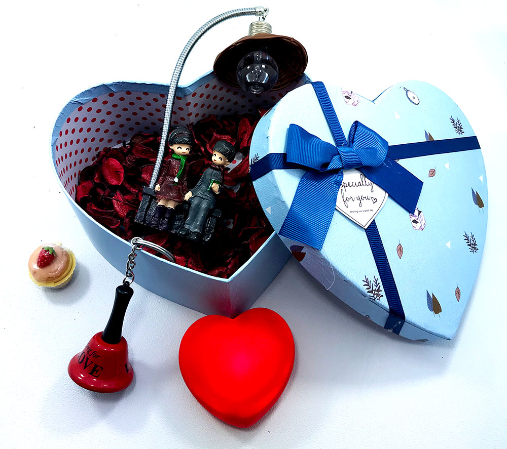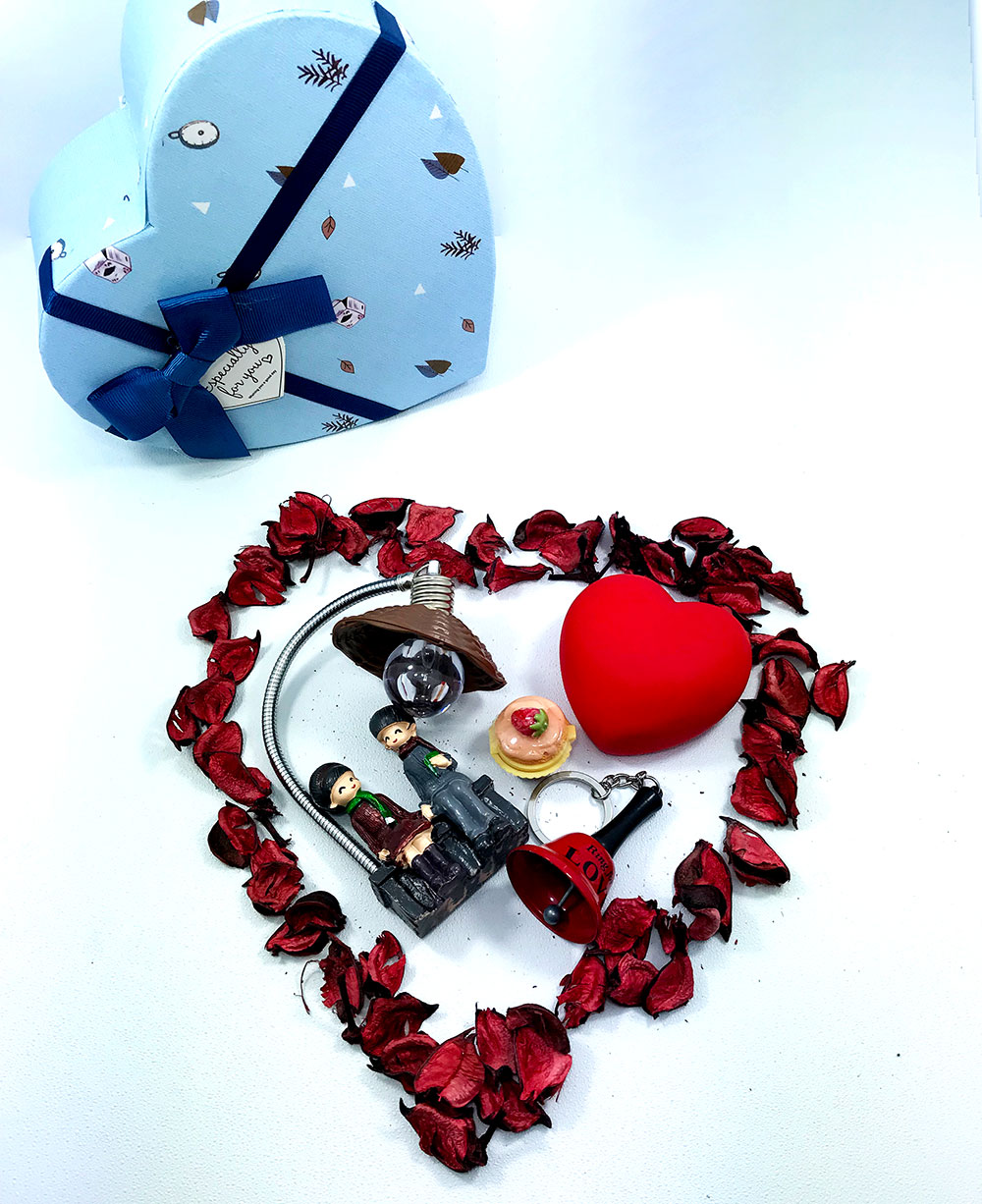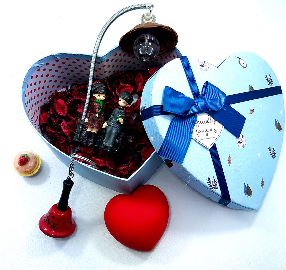 Kalpli Kutu Aşk Seti… sevgilinize romantik hediye arıyorsanız bu kutu tam size göre. Kalp şeklinde kutu , ışık altında oturan sevgililer ve kurumuş gül yaprakları.