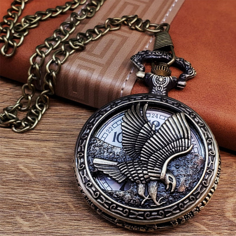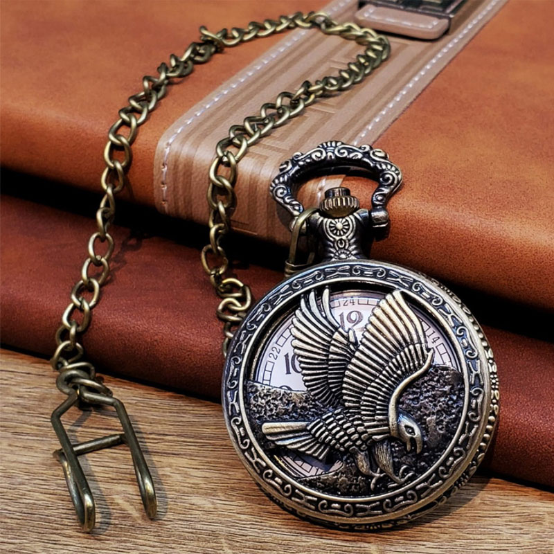 Güç ve özgürlüğü simgeleyen Kartal Tasarımlı Köstekli Saat, antika tarzı ve kabartmalı kartal detayıyla koleksiyonluk bir aksesuardır.