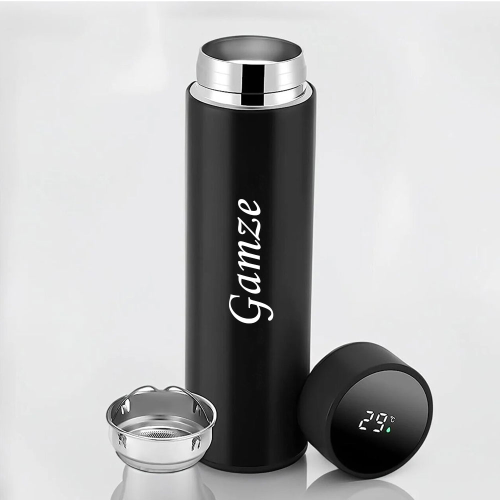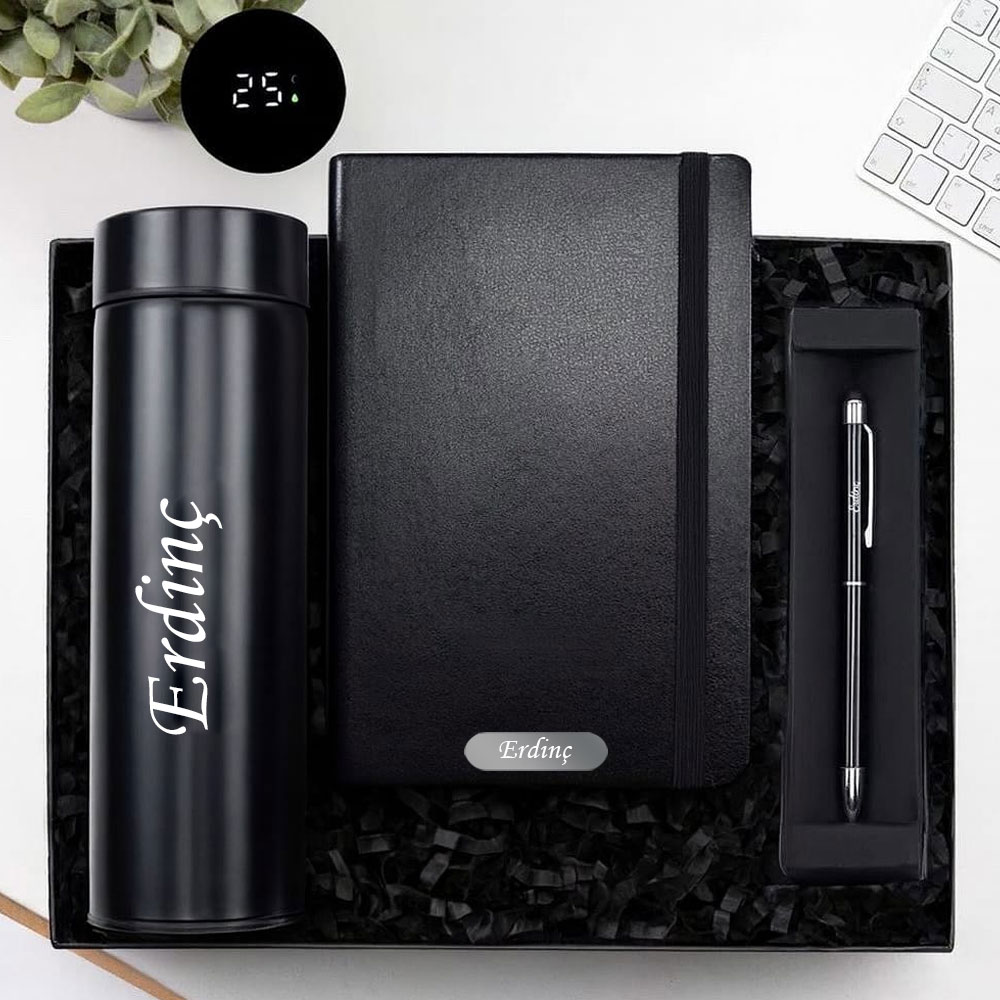 Kişiye Özel Dereceli Termos ve Defter Seti; 500 ml sıcaklık göstergeli termos ve isim yazılabilir defteriyle şık, kullanışlı hediye seçeneği.