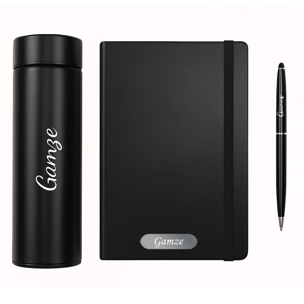 Set içinde yer alan kaliteli sert kapaklı defter ile birlikte, tüm ürünlerin üzerine isim, logo veya firma ismi lazer ile kişiye özel olarak yazılabilir.