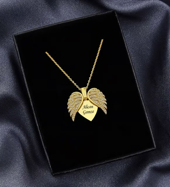 Kişiye Özel Melek Kanatlı Kalp Kolye , içerisine isim yazılır.Lazer kazıma ile isim yazıldığı için isimde silinme olmaz.