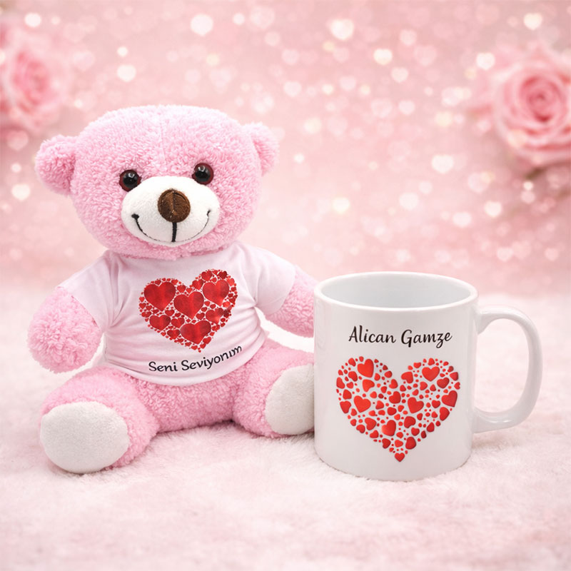 Yumuşacık dokusuyla dikkat çeken peluş ayıcık, dekoratif olarak da kullanılabilirken; kişiye özel kupa ise günlük kullanım için uygundur ve her yudumda sizi hatırlatır. Hem duygusal hem de kullanışlı bir hediye arayanlar için ideal bir settir.