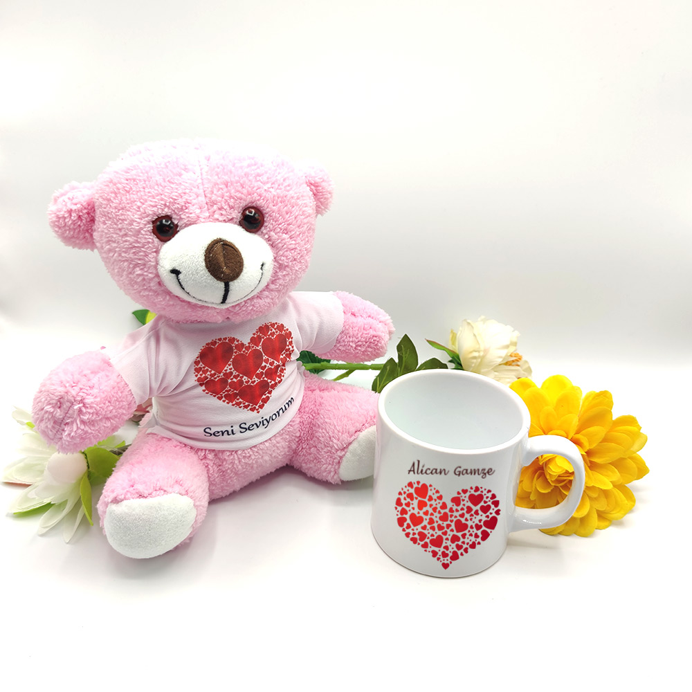 Kişiye Özel Pembe Ayıcıklı Set , sevgilinize alabileceğiniz güzel bir hediyedir.Kupanın üzerinde kalp , kalbin üzerinde isminiz yazmaktadır. ‘Ayıcığın üzerindeki tişörtün 2 farklı modeli mevcuttur.