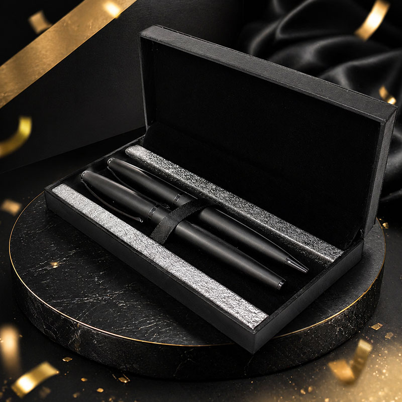 Kişiye özel siyah roller kalem seti. 2’li kutulu şık tasarım, isim yazılı hediye seçeneği. Kurumsal ve özel günler için ideal.