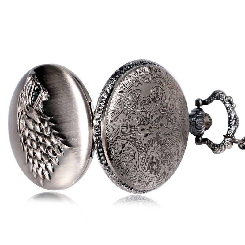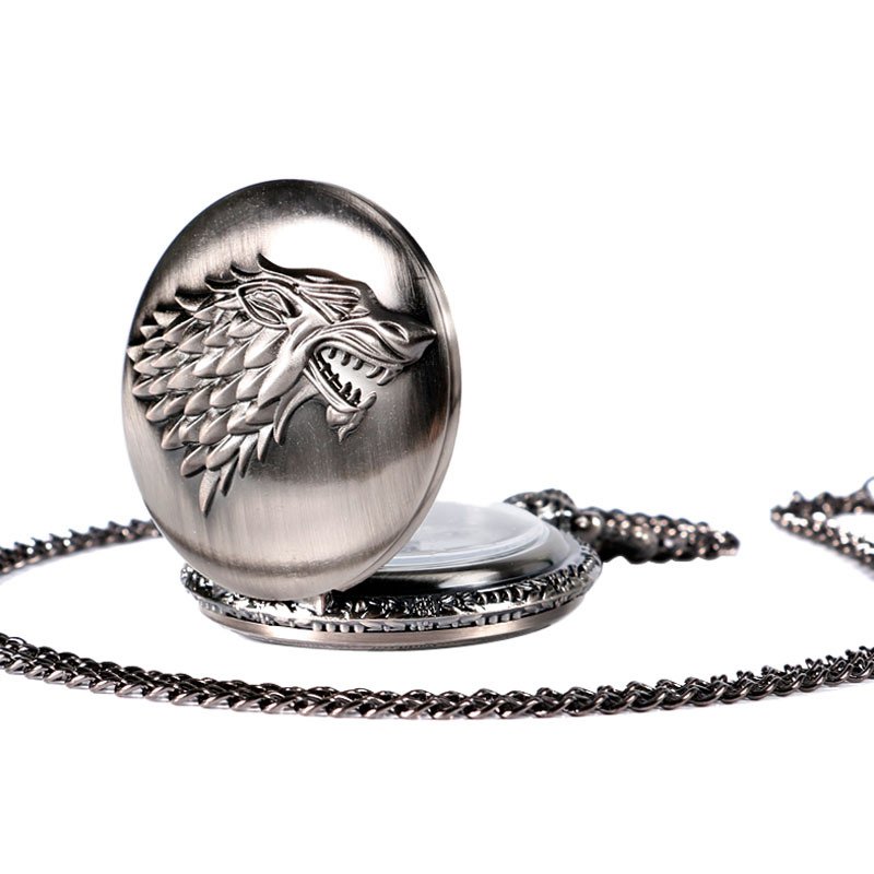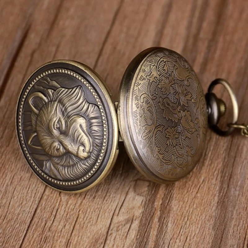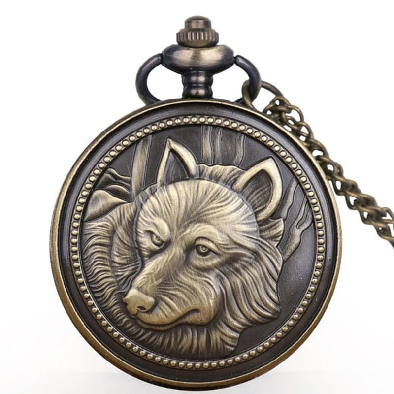 Kurt tasarımlı köstekli saat; nostaljik bronz gövdesi, detaylı kurt figürü ve 30 cm zinciriyle şık ve anlamlı bir erkek cep saati modelidir.
