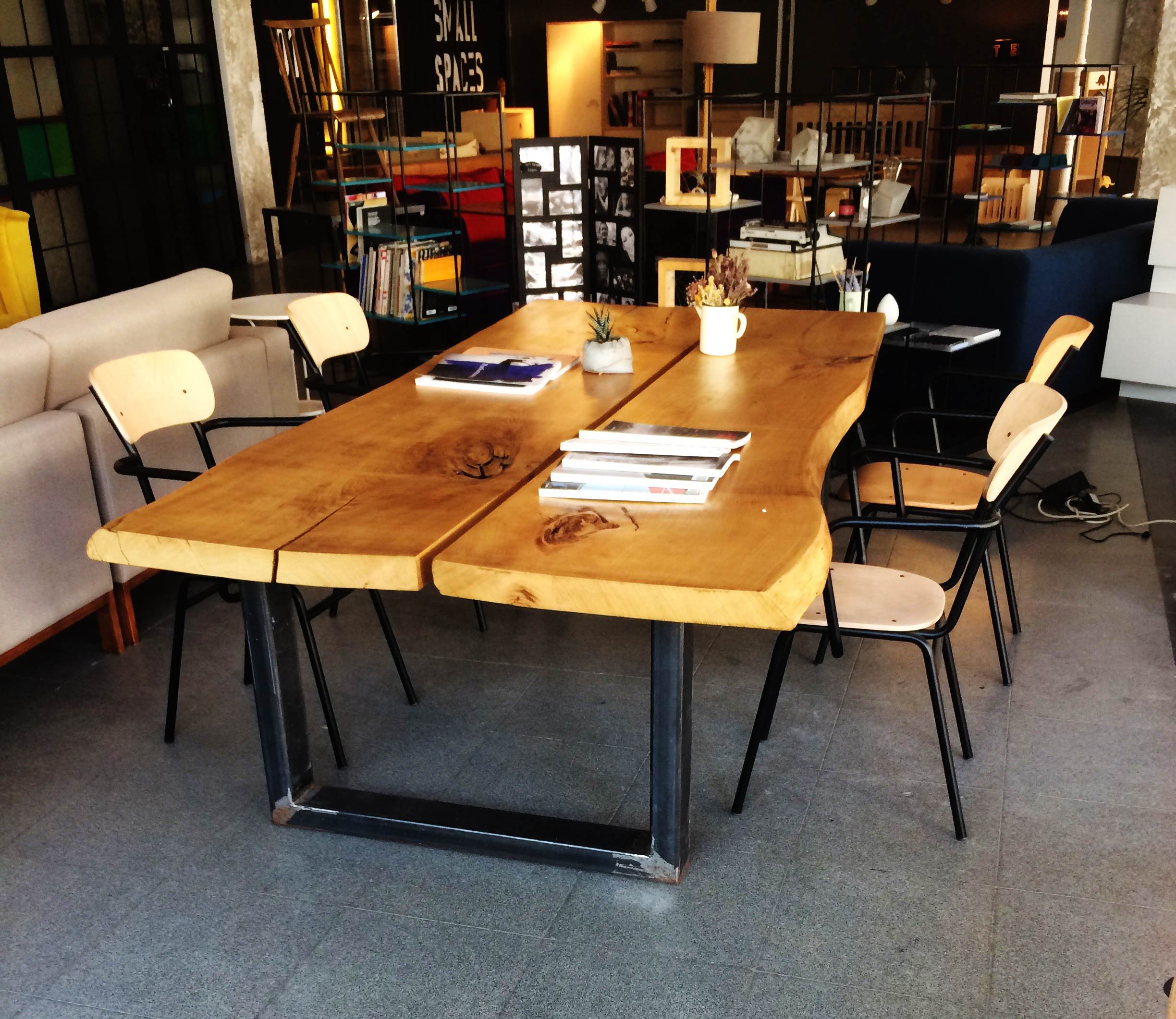 Masif Masa ayakları demirden üretilmiş bulunduğu mekana modern çizgileri ile hoşluk verecek bir masa.