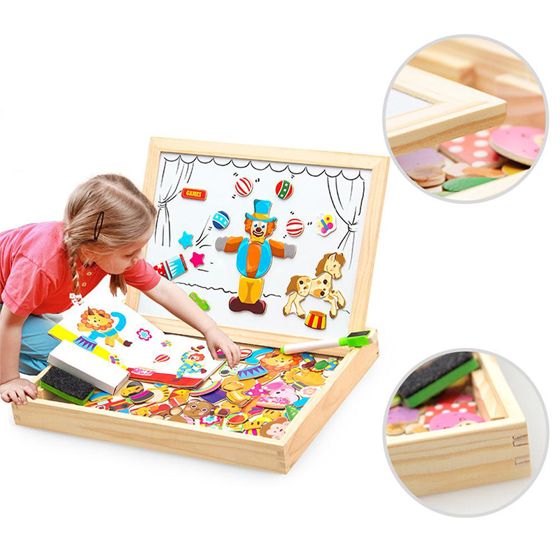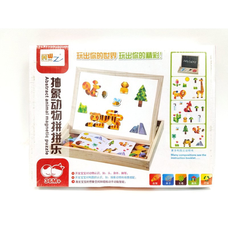 Mıknatıslı Puzzle ve Yazı Tahtası çocuklarınız için eğlenceli bir oyundur. Bir tarafı beyaz manyetik alandır. Bu alanda içinde bulunan figürleri birleştirip puzzle ı tamamlayabilirler ve aynı zamanda içerisinden çıkan kalem ile yazı ve ya şekiller yapabilirler. Diğer tarafı kara tahtadır. Kutu içerisinden çıkan tebeşirlerle bu alana yazı yazabilirler.