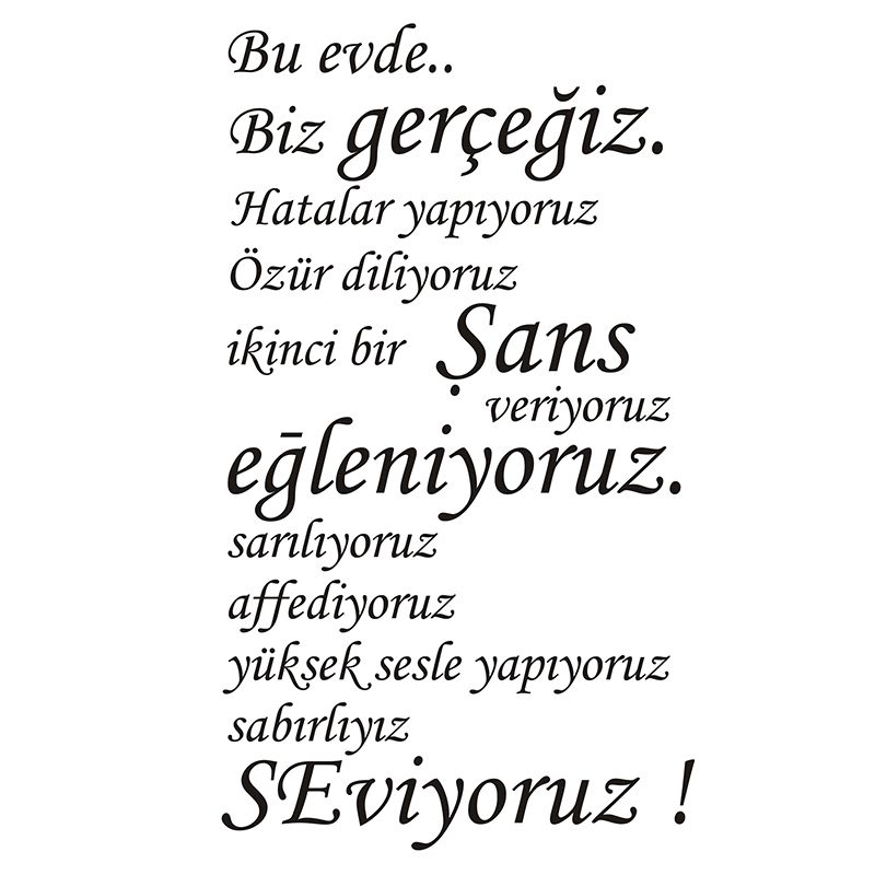 Seviyoruz Sticker Duvarlarınızı sizi anlatan stickerlarla süsleyin. Transfer kağıdı mevcuttur. Rahatlıkla duvarınıza yapıştırabilirsiniz.