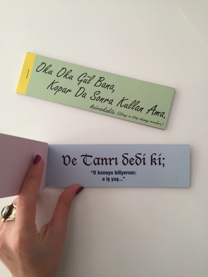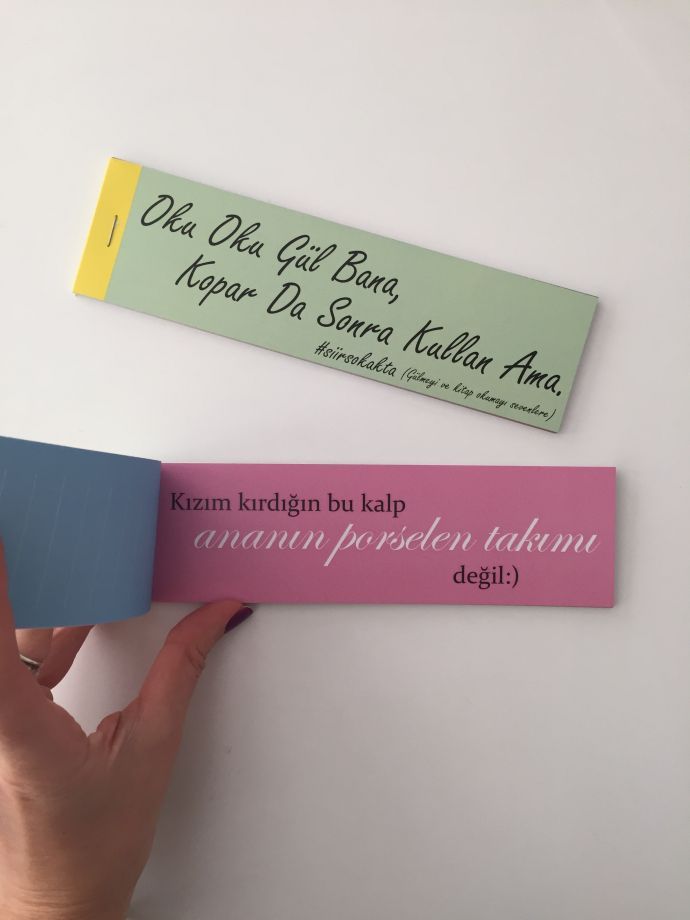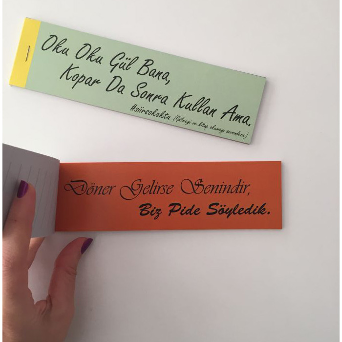 Şiir sokakta Kitabı: Bu incecik bir kitap. Bu kitabın her sayfasını dilerseniz yırtıp kitap ayracı olarak kullanabiliyorsunuz. Yani aslında bu kitap aynı zamanda 10 adet kitap ayracı. Hem gülmelik, hem hediye etmelik, hem de bol bol sevmelik!