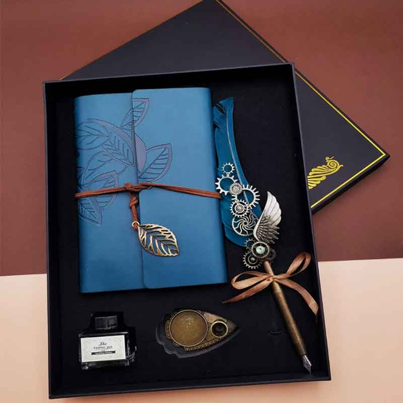 Tüylü Divit Kalem ve Deri Defter Seti, zarif ve nostaljik tasarımıyla yazı tutkunları için özel olarak hazırlanmıştır. Set içerisinde tüylü divit kalem, mürekkep şişesi, metal kalem standı ve isme özel deri defter bulunur. Deri defter üzerine lazerle isim yazılabilir. Mavi, kırmızı, yeşil, siyah ve mor olmak üzere 5 renk seçeneğiyle sunulur.