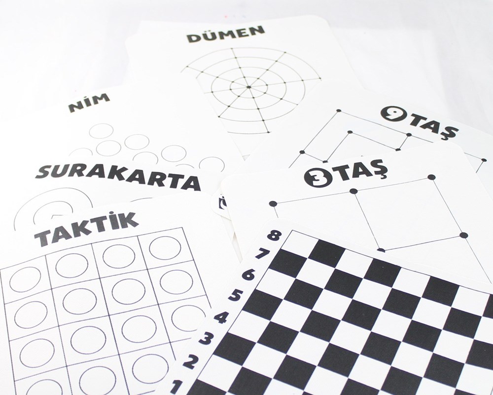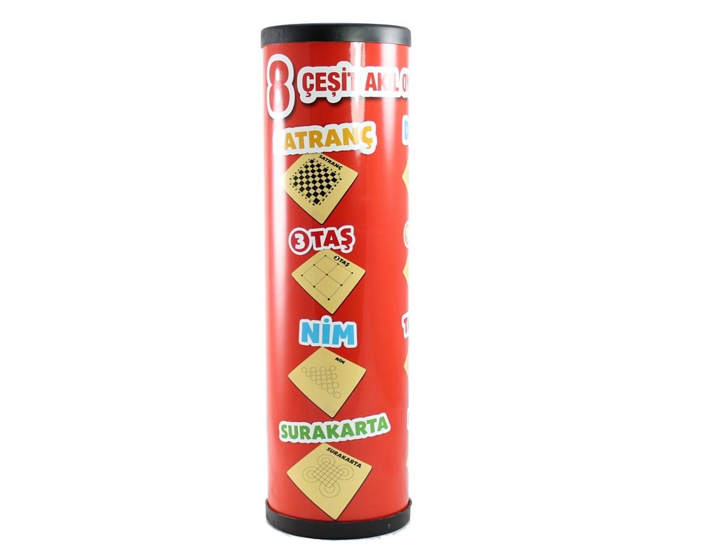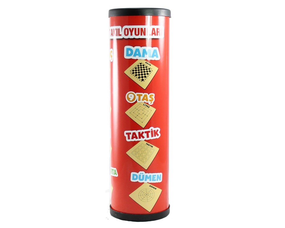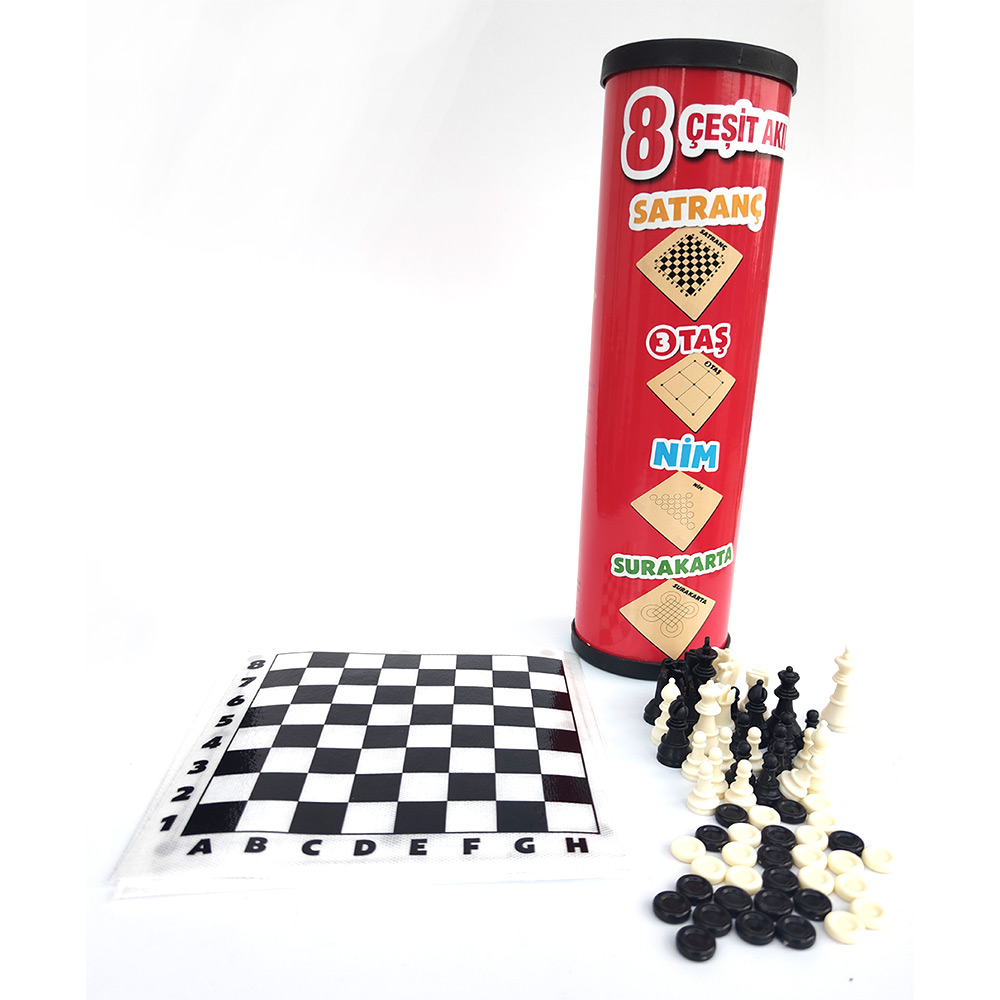 Strateji Oyunu, silindir ambalajı içerisinde 7 tane oyun pedi ve piyon seti bulunmaktadır. Satranç – 3 Taş – Nim – Surakarta – Dama – 9 Taş – Taktik – Dümen oyunlarını oynayabileceğiniz tek bir set.