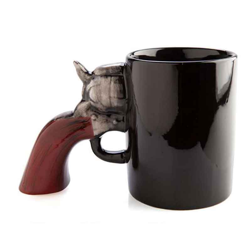 Wanted tabanca kulplu kupa, 11.5x19 cm ölçülerinde seramik tasarım. 3D silah kulp ve özgün konseptiyle koleksiyonluk ve hediye için ideal.
