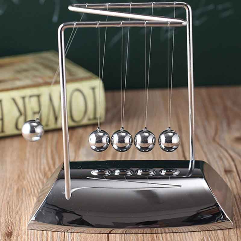 Yan yana dizili 5 adet metal bilye, harekete geçirildiğinde birbirine çarparak ritmik ve rahatlatıcı bir ses çıkarır. Bir süre sonra kendiliğinden duran bu hareket, hem stresinizi azaltır hem de Newton’un hareket yasalarını gözlemlemenize olanak sağlar.